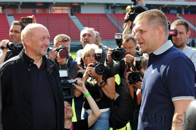 Majiteľ futbalového klubu Spartak Trnava Vladimír Poór (vľavo) a predseda vlády Robert Fico (vpravo) počas otvorenia City Arény v Trnave. Trnava, 22. august 2015. Foto: SITA/Ivan Kopčáni