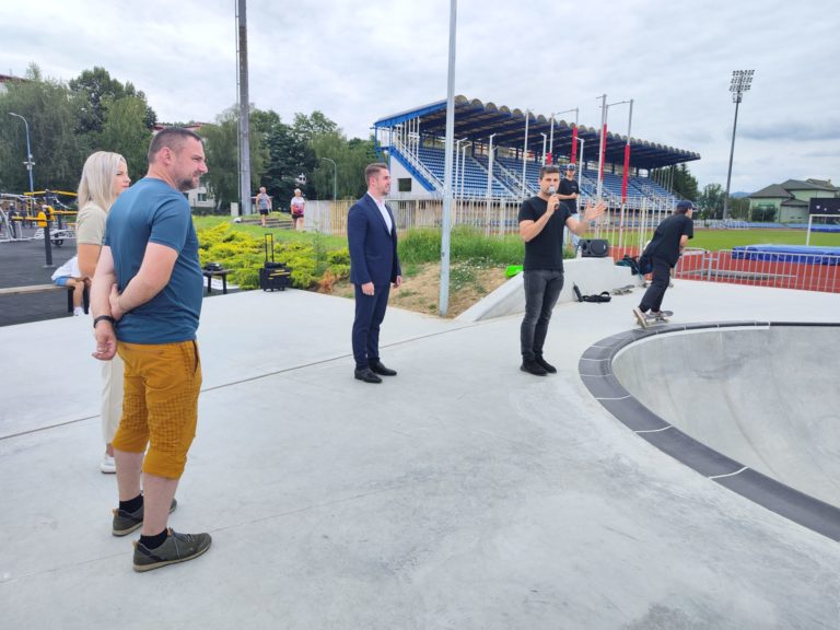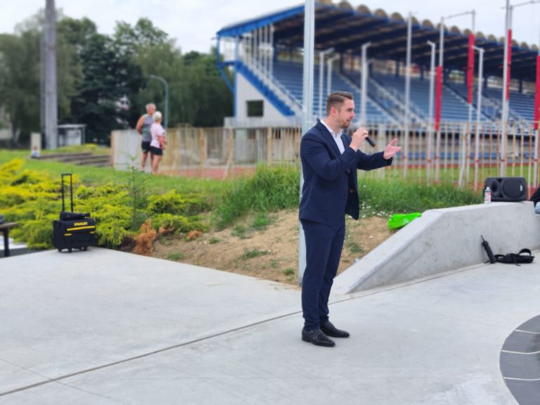 Primátor mesta Peter Wolf počas otvorenia nového skateparku v športovom areáli na Ulici Športovcov v Dubnici nad Váhom v rámci prvej etapy výstavby z troch. Druhá etapa skateparku by sa mala začať budovať ešte tento rok. Dubnica nad Váhom, 3. júl 2024. Foto: SITA/Laura Krošláková