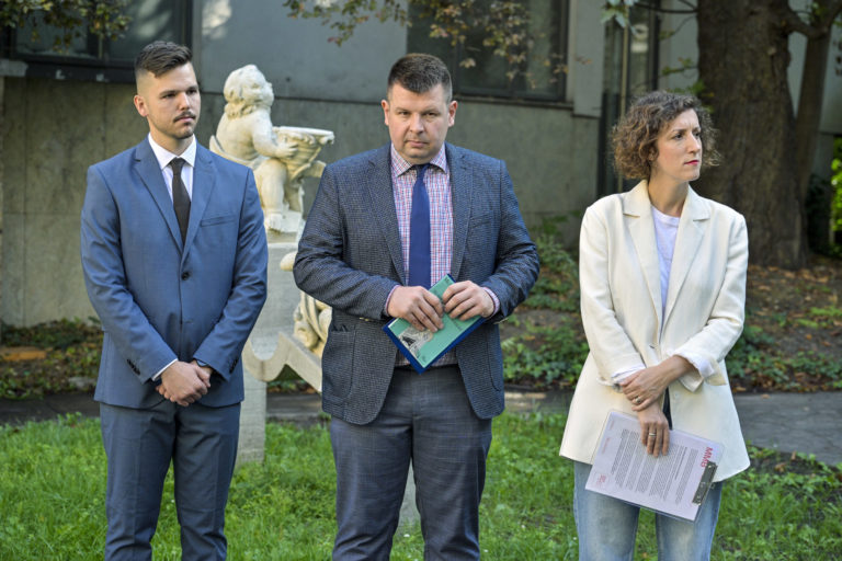 Zľava: Historik a kurátor Múzea mesta Bratislava (MMB) Michal Augustovič, zástupca riaditeľky MMB Daniel Hupko a riaditeľka MMB Zuzana Palicová počas brífingu v Letnej čitáreni U červeného raka pri príležitosti otvorenia obnovenej Michalskej veže. Bratislava 26. september 2023. Foto: SITA/Milan Illík