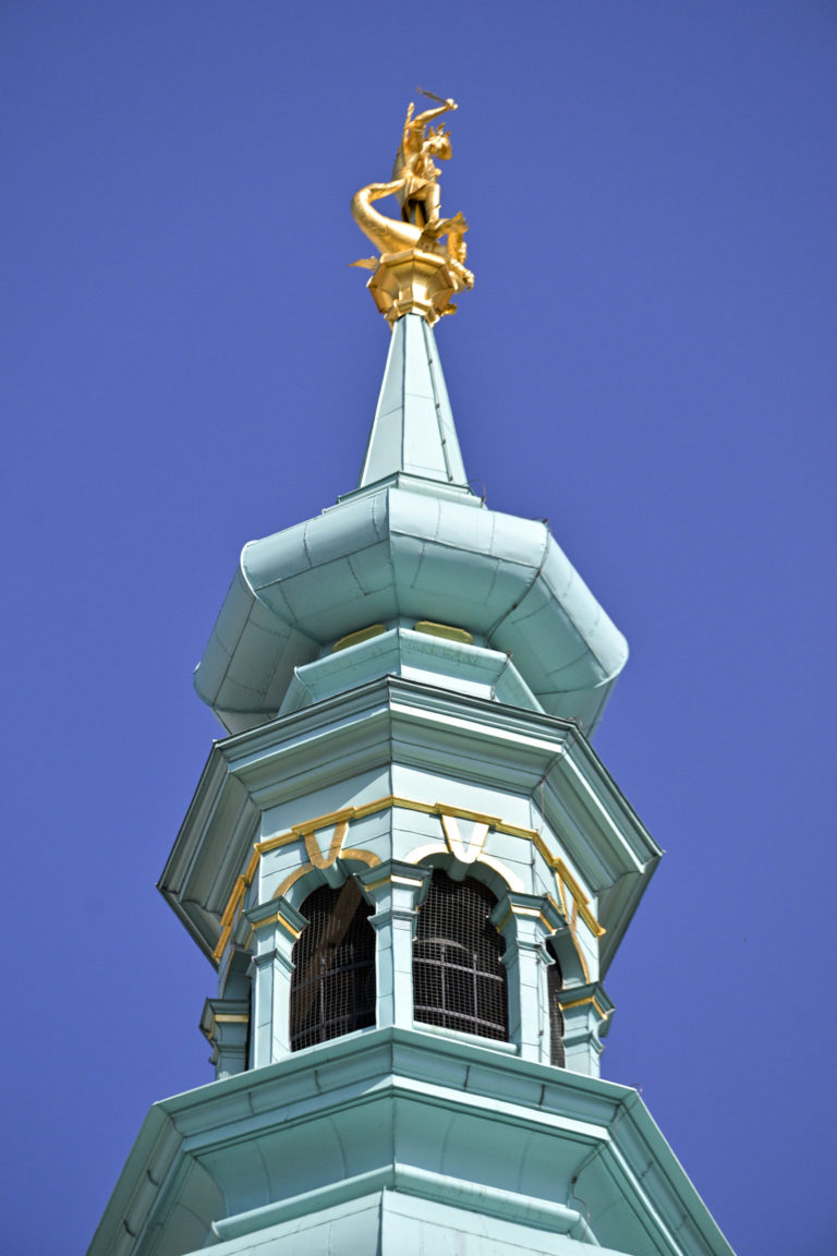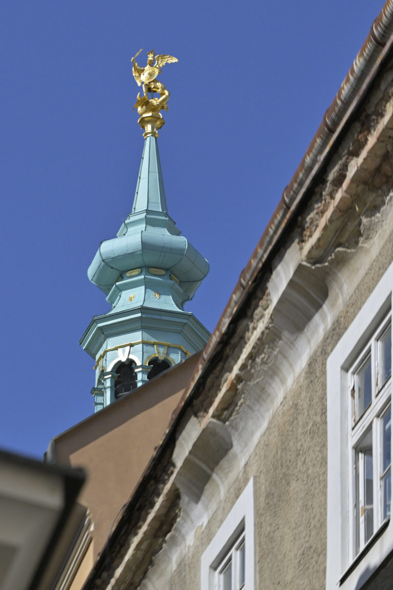 Pohľad na Michalskú vežu so zrekonštruovanou sochou sv. Michala Archanjela pri príležitosti otvorenia obnovenej Michalskej veže v Bratislave. Bratislava, 26. september 2023. Foto: SITA/Milan Illík