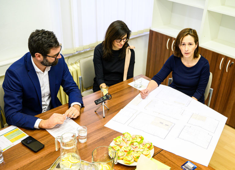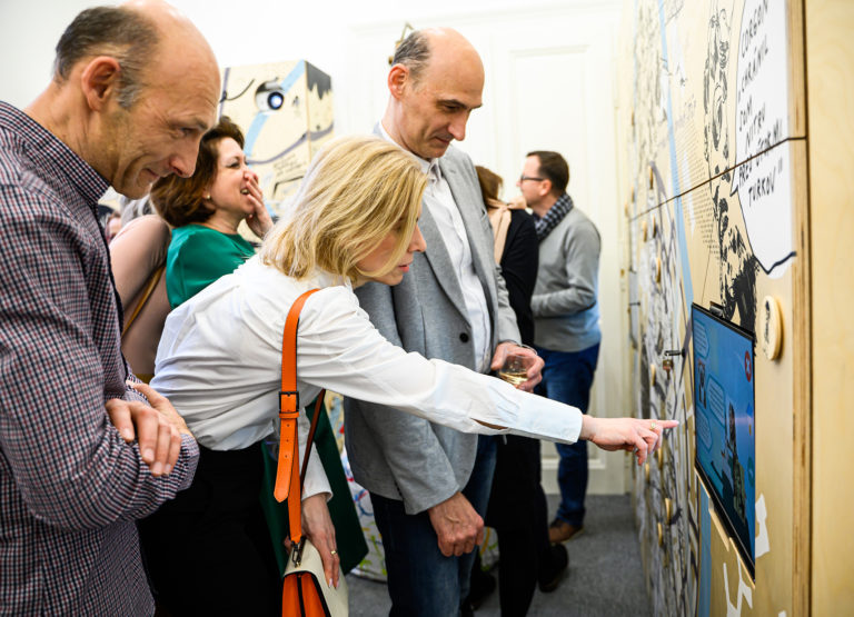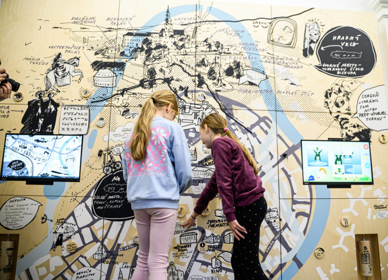 Zľava: Primátor mesta Nitra Marek Hattas a architektky a autorky vizuálneho konceptu a interiéru TICadlova Lenka Kompasová a Lívia Dulíková počas otvorenia novovybudovanej interaktívnej a oddychovej zóny TICadlovo, ktorú vytvorilo Turistické informačné centrum (TIC) v Nitre za takmer 30-tisíc eur. Nitra, 17. február 2023. Foto: SITA/Martin Havran.