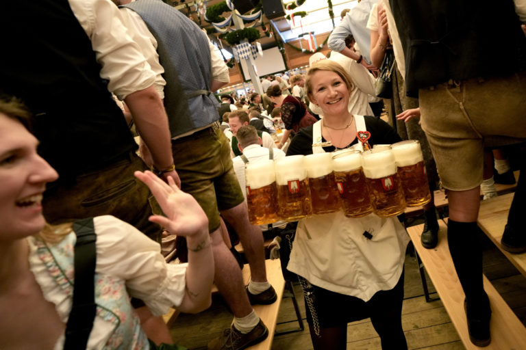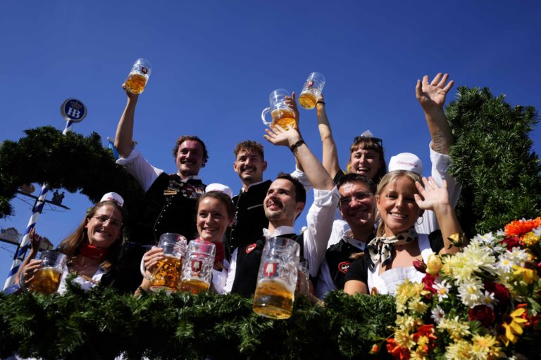 Čašníci a čašníčky na Oktoberfeste držiaci pivá v Mníchove, Nemecku, 16. septembra, 2023. Foto: SITA/AP/Matthias Schrader