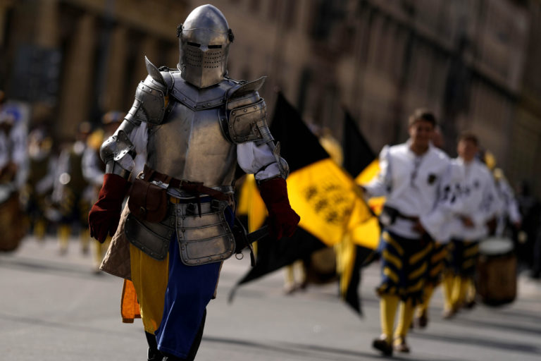 Muž oblečený ako rytier na Oktoberfeste v Mníchove, Nemecku, 16. septembra, 2023. Foto: SITA/AP/Matthias Schrader