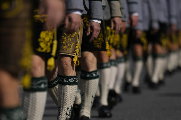 Muži v tradičnom bavorskom kroji na Oktoberfeste v Mníchove, Nemecku, 16. septembra, 2023. Foto: SITA/AP/Matthias Schrader