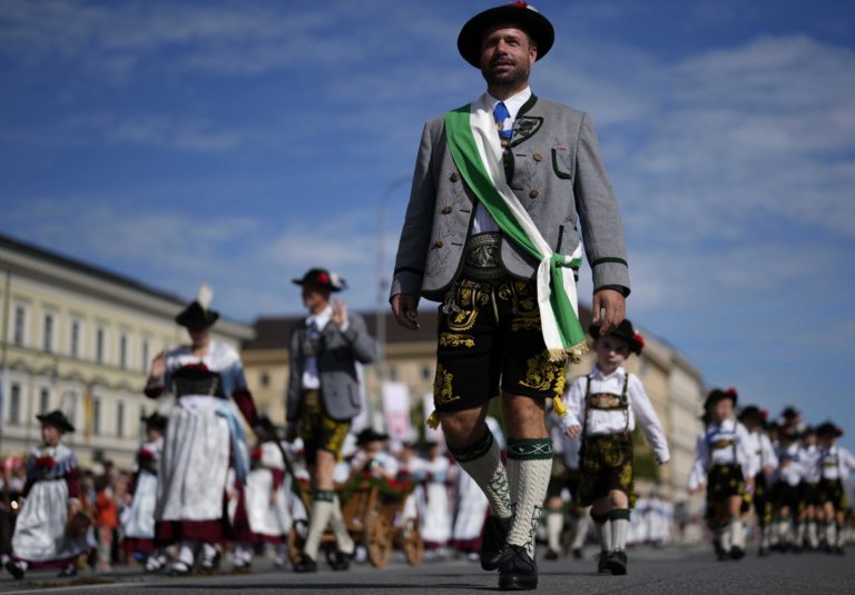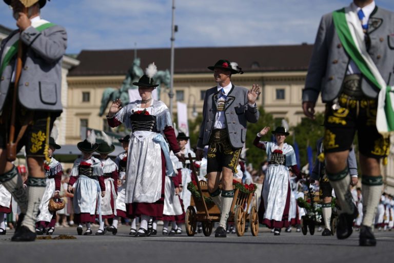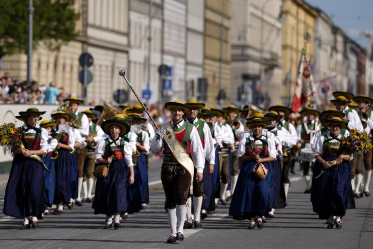 Sprievod ľudí v tradičnom tirolskom kroji v Mníchove, Nemecku, 16. septembra, 2023. Foto: SITA/AP/Matthias Schrader