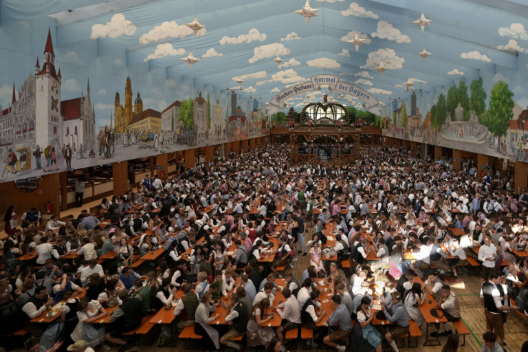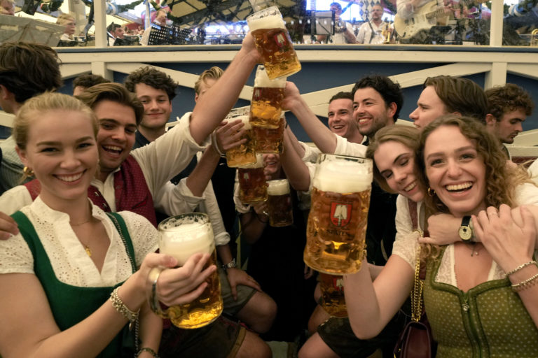 Účastníci Oktoberfestu držiaci pivá v Mníchove, Nemecku, 16. septembra, 2023. Foto: SITA/AP/Matthias Schrader