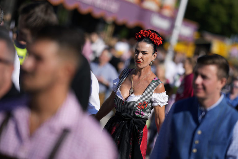 Ľudia v tradičnom bavorskom kroji na Oktoberfeste v Mníchove, Nemecku, 16. septembra, 2023. Foto: SITA/AP/Matthias Schrader