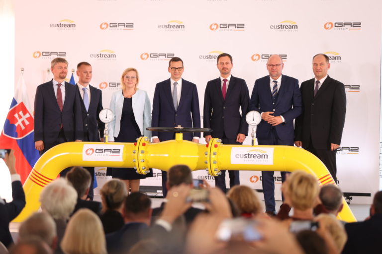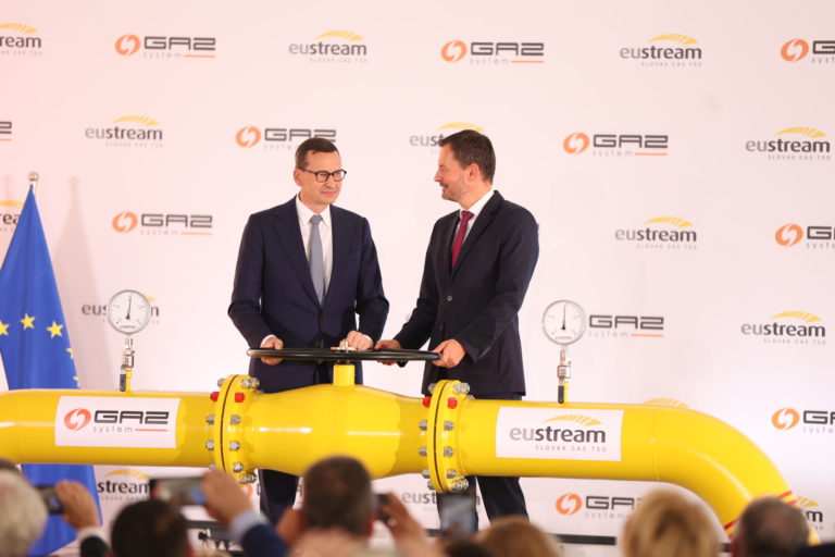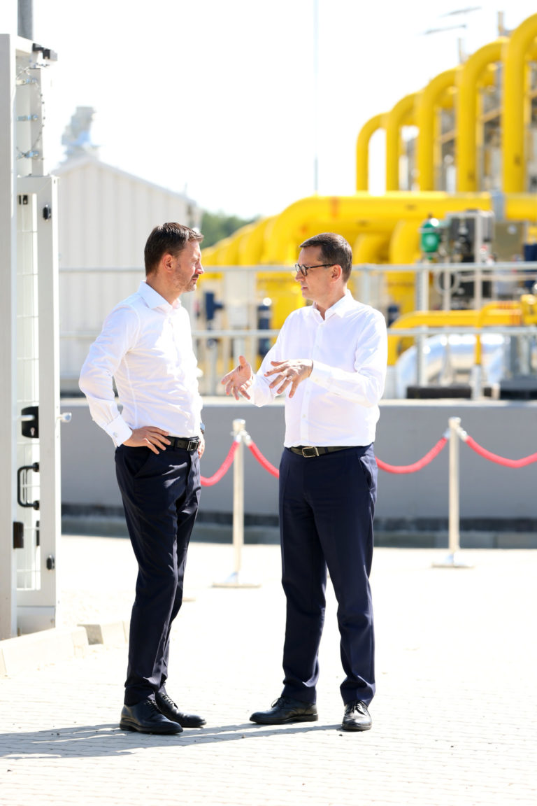 Sprava: Premiér Poľska Mateusz Morawiecki a premiér Slovenska Eduard Heger oficiálne otvorili v poľskej obci Strachocina plynovodné prepojenie medzi Slovenskom a Poľskom. Poľsko, Strachocina, 26. august 2022. Foto: SITA/Marek Lukáč