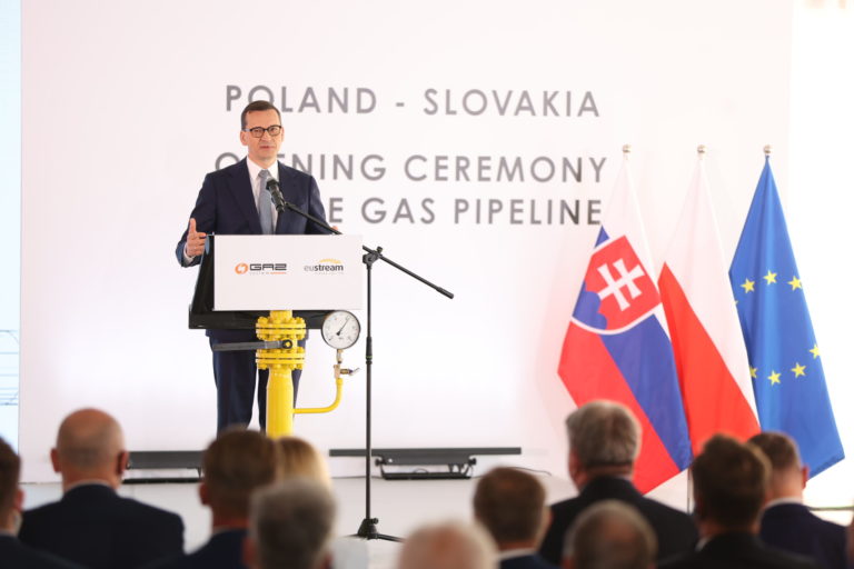 Premiér Poľska Mateusz Morawiecki počas tlačovej konferencie v poľskej obci Strachocina, na ktorej spolu s premiérom Slovenska oficiálne otvorili plynovodné prepojenie medzi Slovenskom a Poľskom. Poľsko, Strachocina, 26. august 2022. Foto: SITA/Marek Lukáč