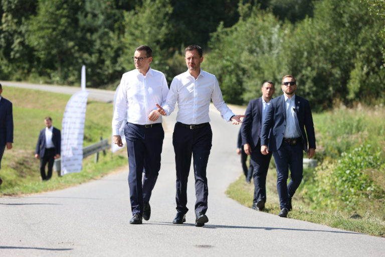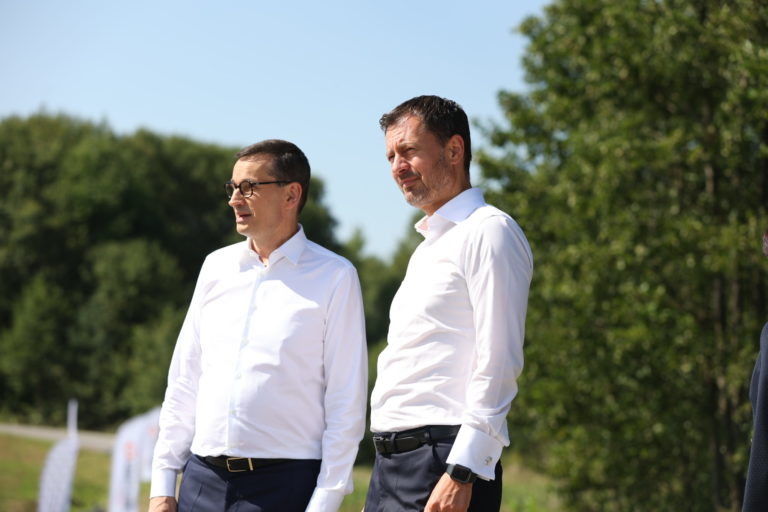 Zľava v popredí: Premiér Poľska Mateusz Morawiecki a premiér Slovenska Eduard Heger oficiálne otvorili v poľskej obci Strachocina plynovodné prepojenie medzi Slovenskom a Poľskom. Poľsko, Strachocina, 26. august 2022. Foto: SITA/Marek Lukáč