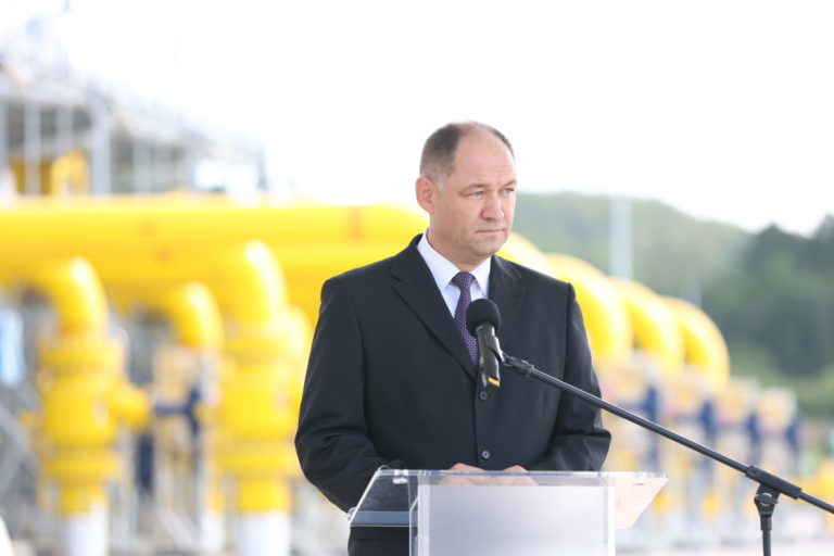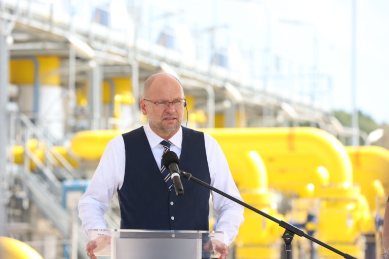 Generálny riaditeľ spoločnosti Eustream Rastislav Òukovič počas oficiálneho otvorenia plynovodného prepojenia medzi Slovenskom a Poľskom v poľskej obci Strachocina. Poľsko, Strachocina, 26. august 2022. Foto: SITA/Marek Lukáč
