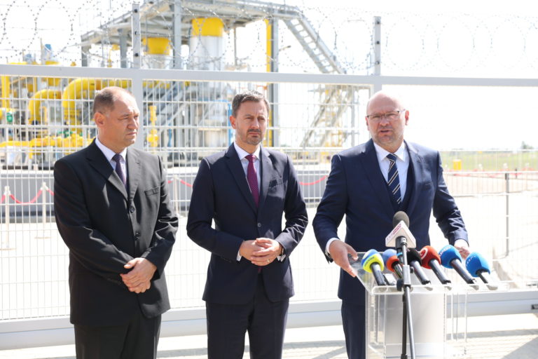 Zľava: Generálny riaditeľ spoločnosti Eustream Rastislav Òukovič, premiér Slovenska Eduard Heger a minister hospodárstva SR Richard Sulík počas oficiálneho otvorenia plynovodného prepojenia medzi Slovenskom a Poľskom v poľskej obci Strachocina. Poľsko, Strachocina, 26. august 2022. Foto: SITA/Marek Lukáč