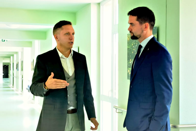 Zľava: Podpredseda BBSK Ondrej Lunter a mestský poslanec Martin Turčan počas prehliadky priestorov novootvoreného Senior centra Tulská v Banskej Bystrici. Foto: SITA/Peter Rusko