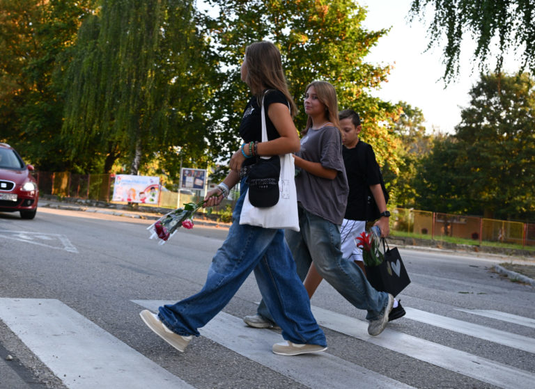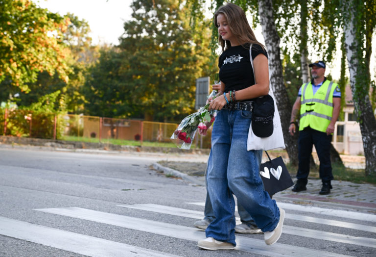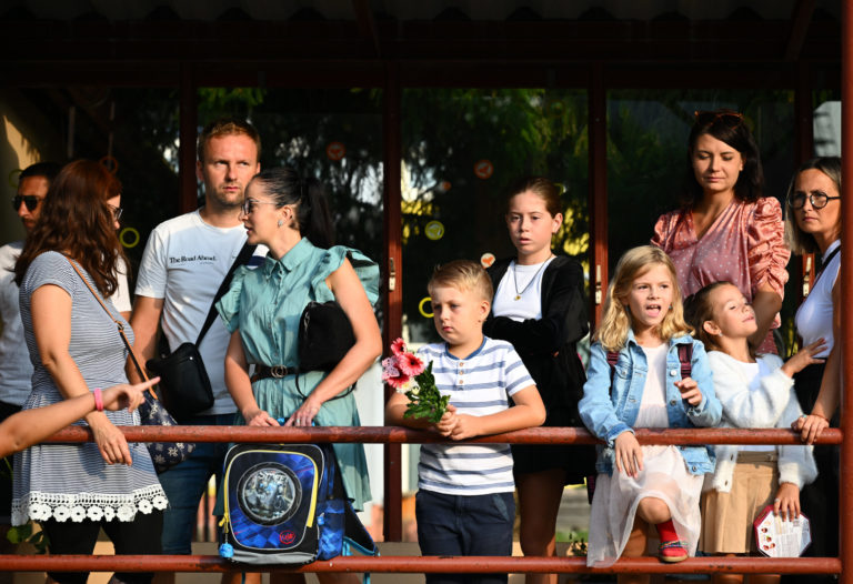 Prezident SR Peter Pellegrini (v popredí vľavo) počas otvorenia nového školského roka 2024/2025 na Základnej škole Slovenského slobodného vysielača v Banskej Bystrici. Banská Bystrica, 2. september 2024. Foto: SITA/Kancelária prezidenta SR