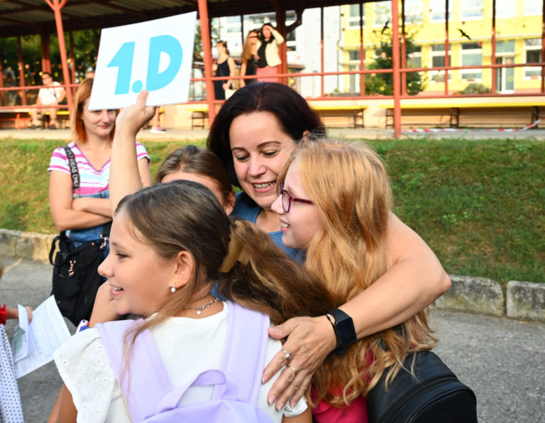 Žiaci 1.D a učiteľka sa vítajú na školskom dvore na Základnej škole v Starej Turej počas začiatku školského roka 2024/2025. Stará Turá, 2. september 2024. Foto: SITA/Martin Medňanský