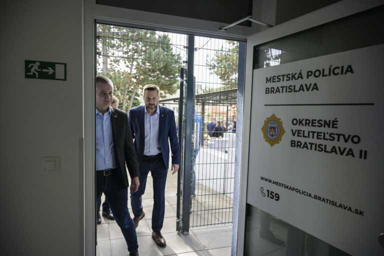 Sprava: Primátor hlavného mesta Matúš Vallo a starosta Ružinova Martin Chren počas otvorenia stanice mestskej polície (MsP) v Ružinove, Okresné veliteľstvo polície Bratislava II. Bratislava, 13. október 2023. Foto: SITA/Milan Illík