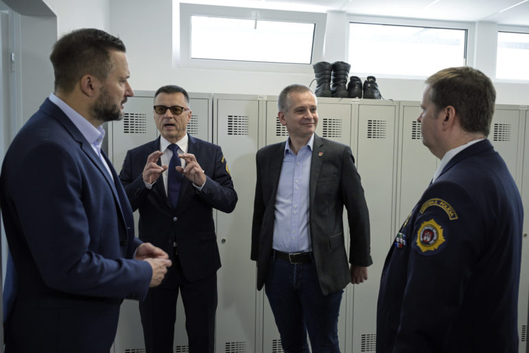 Zľava: Primátor hlavného mesta Matúš Vallo, veliteľ Okrskovej stanice MsP Ružinov Jaroslav Tuleja, starosta Ružinova Martin Chren a náčelník MsP Miroslav Antal počas otvorenia stanice mestskej polície (MsP) v Ružinove, Okresné veliteľstvo polície Bratislava II. Bratislava, 13. október 2023. Foto: SITA/Milan Illík