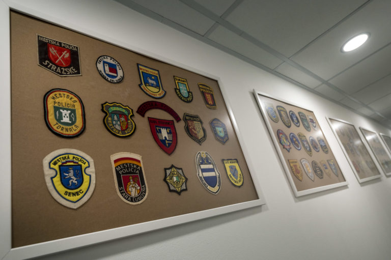 Zbierka policajných nášiviek počas otvorenia stanice mestskej polície (MsP) v Ružinove na Okresnom veliteľstve polície Bratislava II. Bratislava, 13. október 2023. Foto: SITA/Milan Illík
