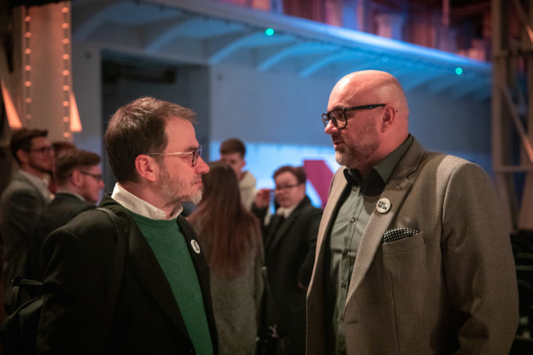 Zľava: Šéfredaktorom Investigatívneho centra Jána Kuciaka (ICJK) Lukáš Diko a šéfredaktor Aktuality.sk Peter Bárdy počas oficiálneho otvorenia „Týždňa Jána a Martiny“ – päť rokov od vraždy Jána Kuciaka a Martiny Kušnírovej v Starej Tržnici v Bratislave. Bratislava, 20. február 2023. Foto: SITA/Diana Černáková