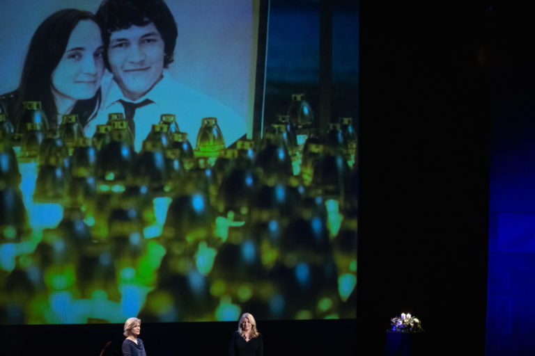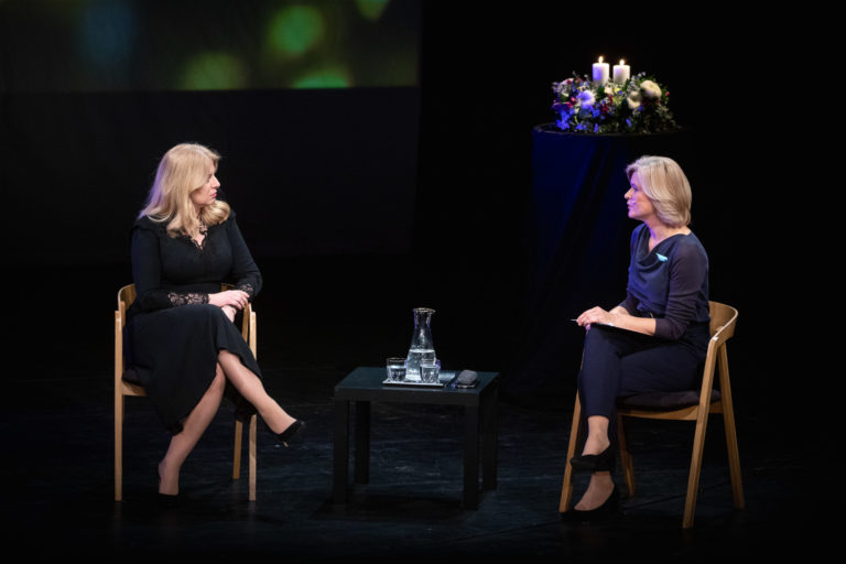 Prezidentka SR Zuzana Čaputová (vpravo) počas spomienkového večera s názvom Body zlomu v novej budove Slovenského národného divadla (SND) pri príležitosti piateho výročia vraždy Jána Kuciaka a Martiny Kušnírovej a prvého výročia brutálnej invázie Ruska na Ukrajine. Bratislava, 20. február 2023. Foto: SITA/Diana Černáková