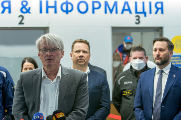 Zľava v popredí: Krajský riaditeľ HaZZ Bratislava Martin Blaha, prednosta Okresného úradu Bratislava Branislav Borovský a primátor Bratislavy Matúš Vallo počas tlačovej konferencie v priestoroch novootvoreného veľkokapacitného Asistenčného centra pomoci (ACP) pre ľudí z Ukrajiny v bývalej autobusovej stanici na Bottovej ulici v Bratislave. Bratislava, 28. marec 2022. Foto: SITA/Ľudovít Vaniher