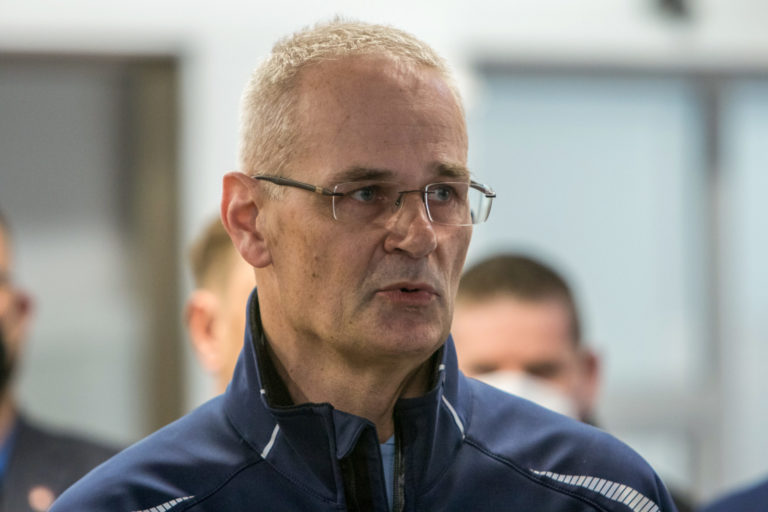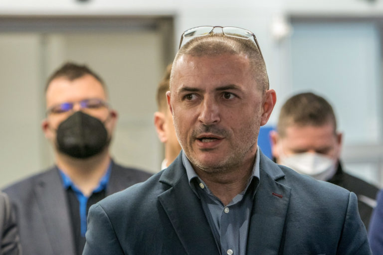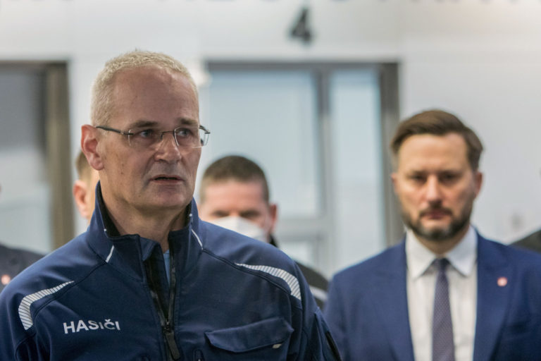 Krajský riaditeľ HaZZ Bratislava Martin Blaha počas tlačovej konferencie v priestoroch novootvoreného veľkokapacitného Asistenčného centra pomoci (ACP) pre ľudí z Ukrajiny v bývalej autobusovej stanici na Bottovej ulici v Bratislave. Bratislava, 28. marec 2022. Foto: SITA/Ľudovít Vaniher