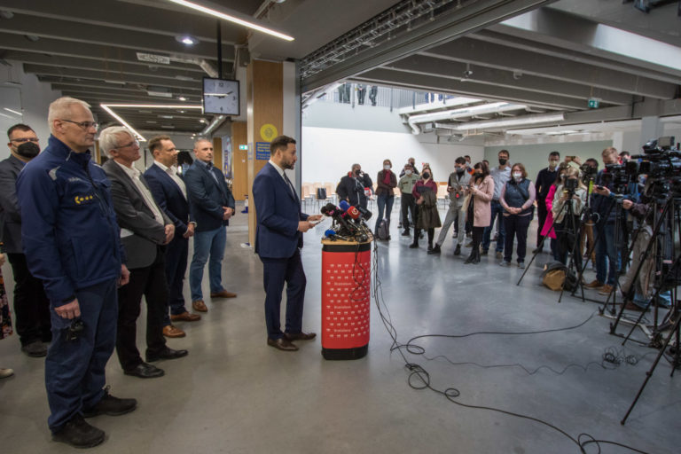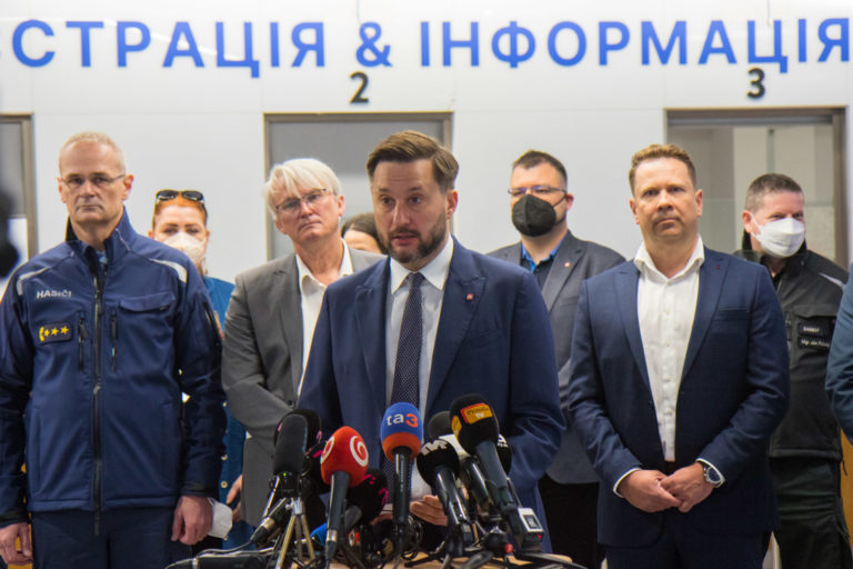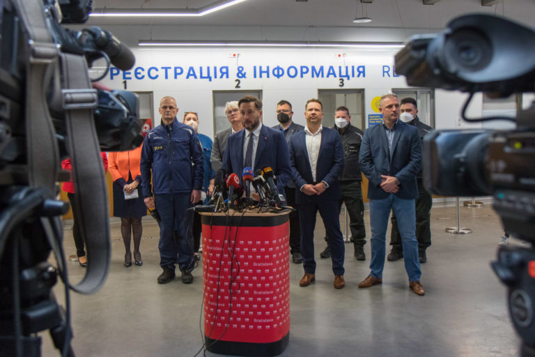 Zľava: Krajský riaditeľ HaZZ Bratislava Martin Blaha, prednosta Okresného úradu Bratislava Branislav Borovský, primátor Bratislavy Matúš Vallo (uprostred) a riaditeľ pre development, HB Reavis Viktor Ondrášek (piaty zľava) počas tlačovej konferencie v priestoroch novootvoreného veľkokapacitného Asistenčného centra pomoci (ACP) pre ľudí z Ukrajiny v bývalej autobusovej stanici na Bottovej ulici v Bratislave. Bratislava, 28. marec 2022. Foto: SITA/Ľudovít Vaniher