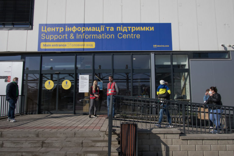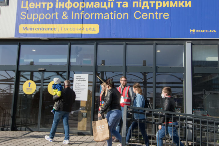 Vstup do priestorov novootvoreného veľkokapacitného Asistenčného centra pomoci (ACP) pre ľudí z Ukrajiny v bývalej autobusovej stanici na Bottovej ulici v Bratislave. Bratislava, 28. marec 2022. Foto: SITA/Ľudovít Vaniher