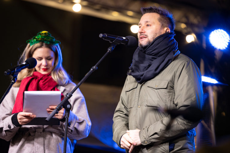 Správa: Moderátorka Kristína Tormová a primátor Bratislavy Matúš Vallo počas otvorenia vianočných trhov a rozsvietenia vianočného stromčeka na bratislavskom Hlavnom námestí. Bratislava, 24. november 2023. Foto: SITA/Jana Birošová