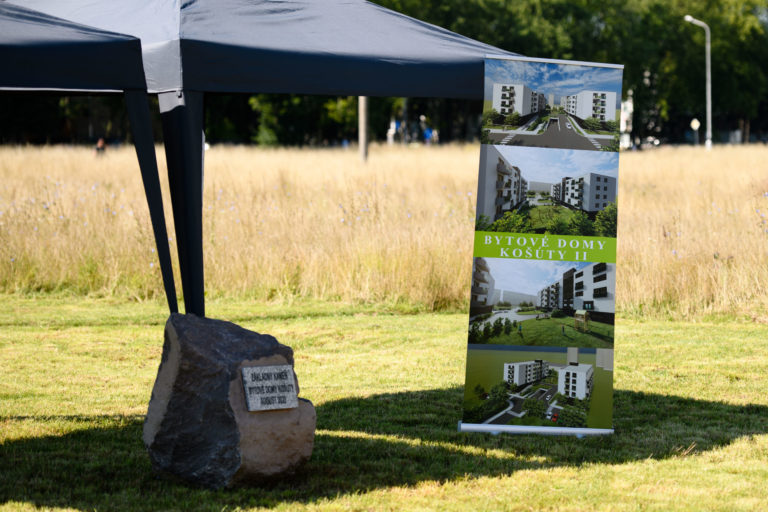 Základný kameň stavby počas slávnostného otvorenia výstavby nových nájomných bytov v Martine, v mestskej časti Košúty. Foto: SITA/Milo Fabia