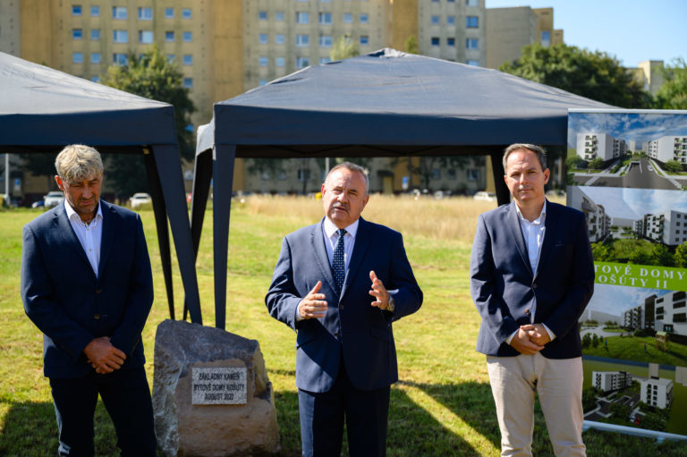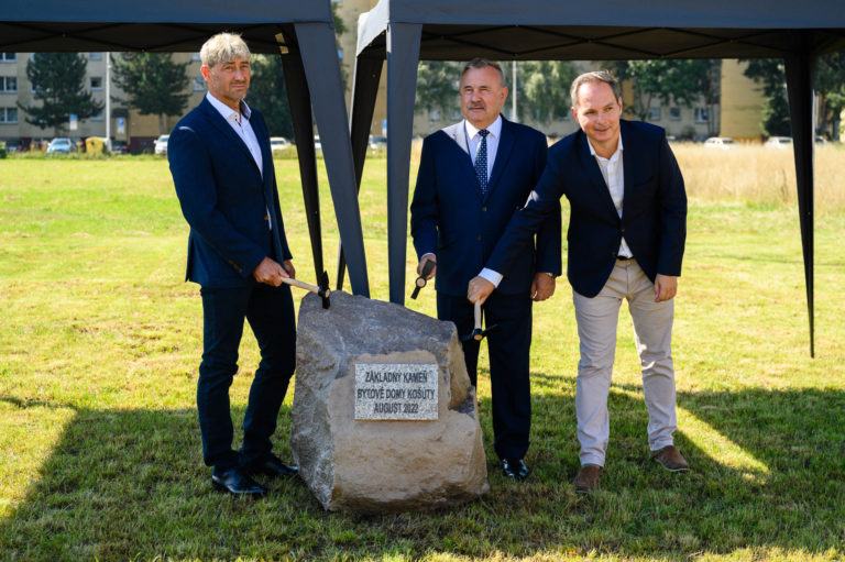 Zľava: Zástupca spoločnosti BYTY Košúty Marián Styk, primátor mesta Martin Ján Danko a poslanec mestskej časti Košúty Dalibor Steindl počas poklepania základného kameňa pri príležitosti slávnostného otvorenia výstavby nových nájomných bytov v mestskej časti Martin-Košúty. Foto: SITA/Milo Fabia