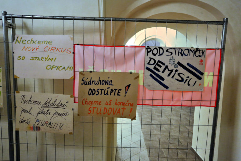 Archívna fotografia z demoštrácie študentov počas otvorenia interaktívnej výstavy dobových dokumentov a predmetov z obdobia Nežnej revolúcie s názvom Kľúčové okamihy v Banskej Bystrici. Banská Bystrica, 15. november 2019. Foto: SITA/Peter Rusko