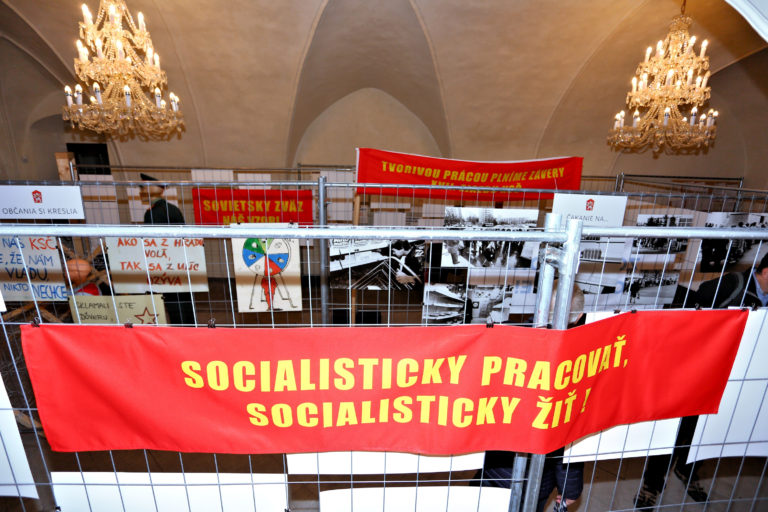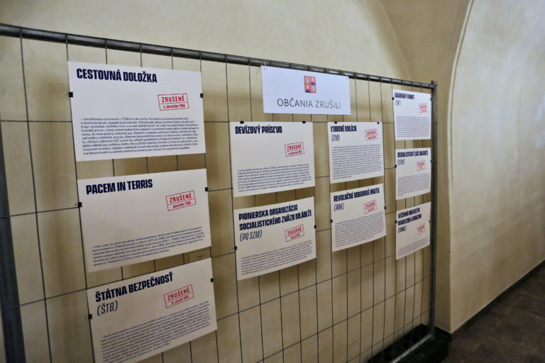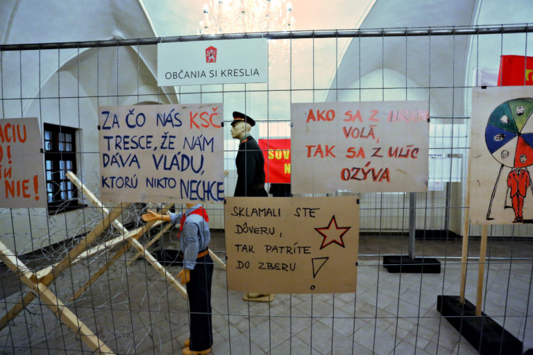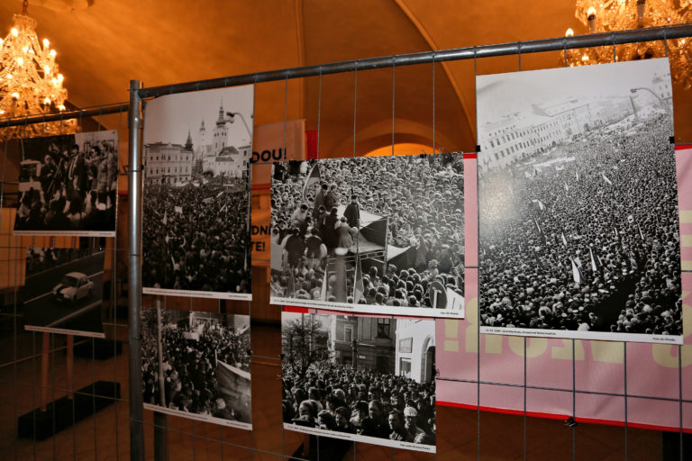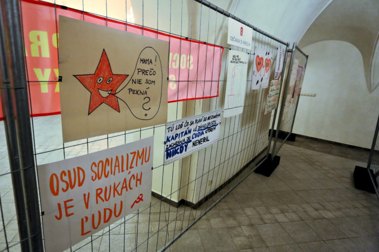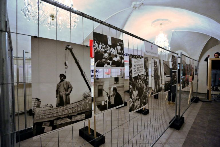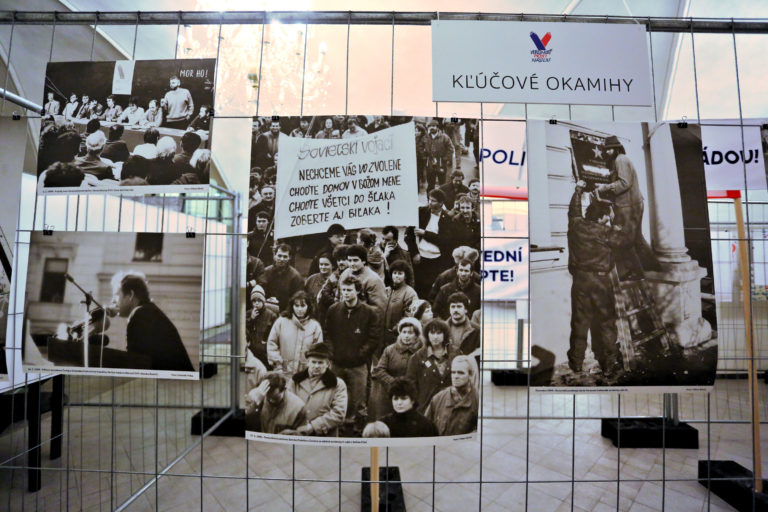 Transparenty a fotografie počas otvorenia interaktívnej výstavy dobových dokumentov a predmetov z obdobia Nežnej revolúcie s názvom Kľúčové okamihy v Banskej Bystrici. Banská Bystrica, 15. november 2019. Foto: SITA/Peter Rusko