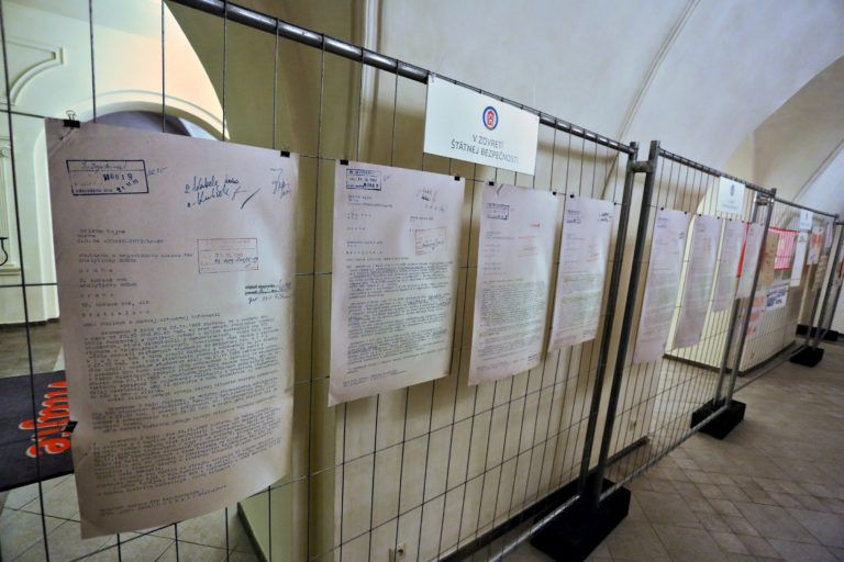Dokumenty z hlásenia štátnej politickej tajnej služby Ministertva vnútra ČSSR v povojnovom období (TB) počas otvorenia interaktívnej výstavy dobových dokumentov a predmetov z obdobia Nežnej revolúcie s názvom Kľúčové okamihy v Banskej Bystrici. Banská Bystrica, 15. november 2019. Foto: SITA/Peter Rusko