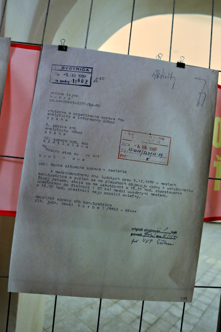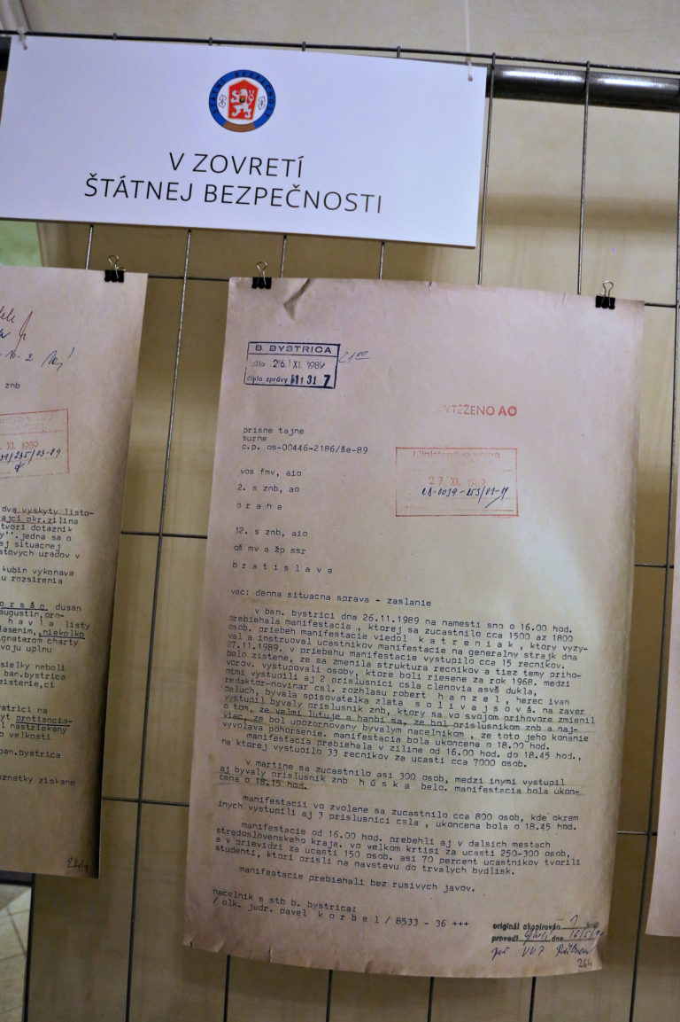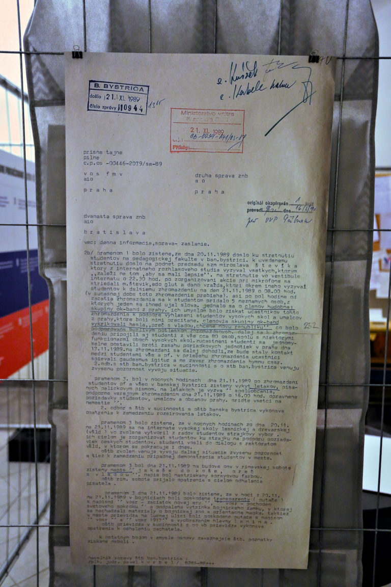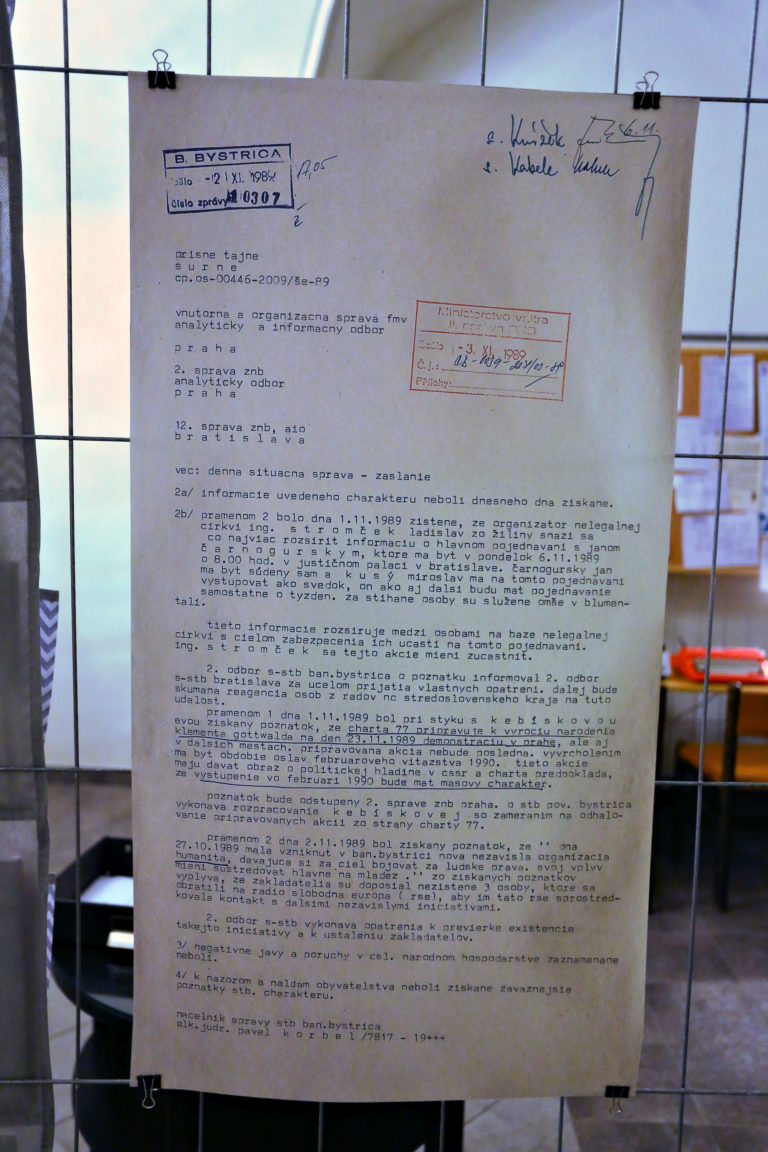 Dokument z hlásenia štátnej politickej tajnej služby Ministertva vnútra ČSSR v povojnovom období (TB) počas otvorenia interaktívnej výstavy dobových dokumentov a predmetov z obdobia Nežnej revolúcie s názvom Kľúčové okamihy v Banskej Bystrici. Banská Bystrica, 15. november 2019. Foto: SITA/Peter Rusko