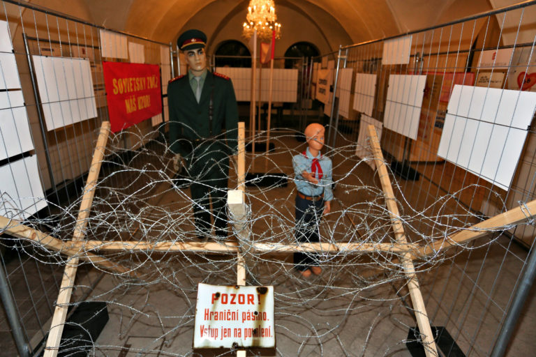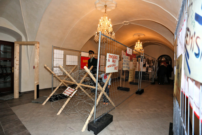 Symbolicky osadená hraničná zátarasa počas otvorenia interaktívnej výstavy dobových dokumentov a predmetov z obdobia Nežnej revolúcie s názvom Kľúčové okamihy v Banskej Bystrici. Banská Bystrica, 15. november 2019. Foto: SITA/Peter Rusko