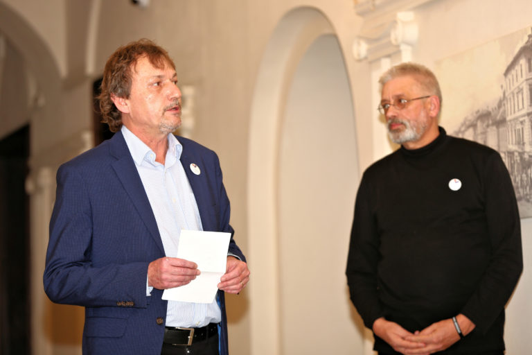 Zľava: Poslanec Mestského zastupiteľstva Banská Bystrica Martin Úradníček a viceprimátor Milan Lichý počas otvorenia interaktívnej výstavy dobových dokumentov a predmetov z obdobia Nežnej revolúcie s názvom Kľúčové okamihy v Banskej Bystrici. Banská Bystrica, 15. november 2019. Foto: SITA/Peter Rusko