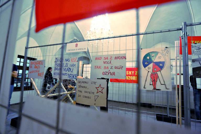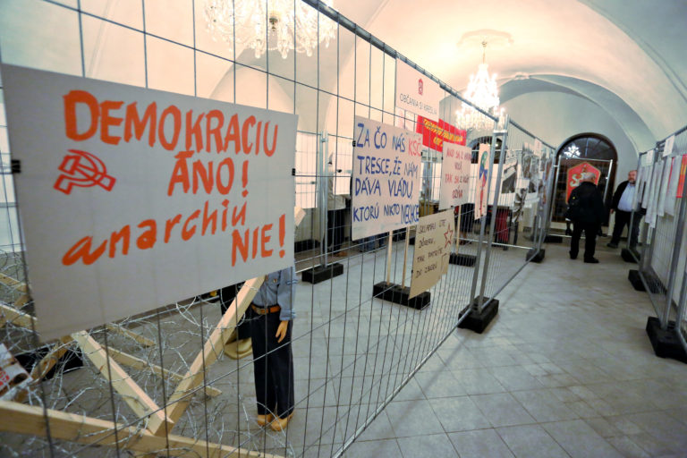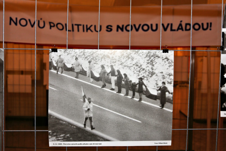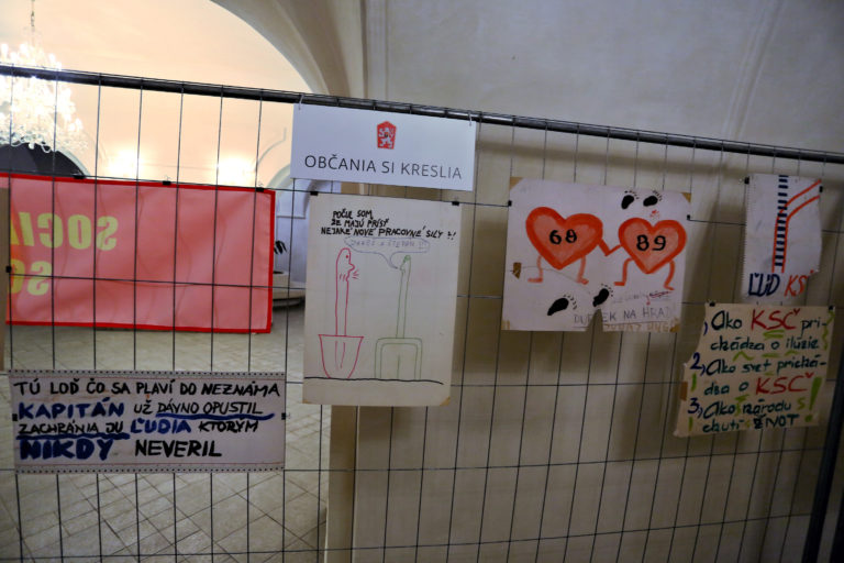 Transparenty občanov počas otvorenia interaktívnej výstavy dobových dokumentov a predmetov z obdobia Nežnej revolúcie s názvom Kľúčové okamihy v Banskej Bystrici. Banská Bystrica, 15. november 2019. Foto: SITA/Peter Rusko