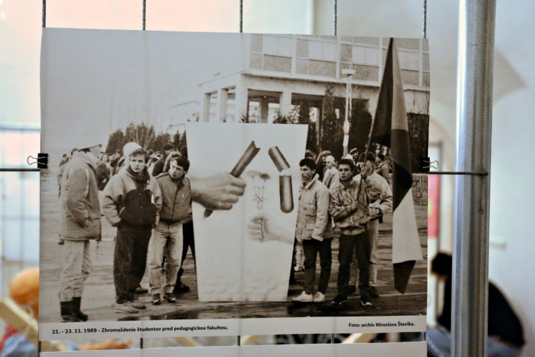 Archívna fotografia zo zhromaždenia študentov počas otvorenia interaktívnej výstavy dobových dokumentov a predmetov z obdobia Nežnej revolúcie s názvom Kľúčové okamihy v Banskej Bystrici. Banská Bystrica, 15. november 2019. Foto: SITA/Peter Rusko