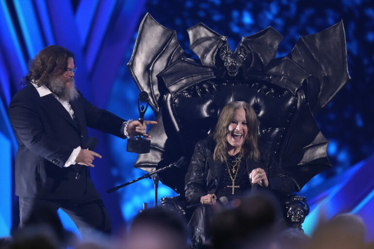 Jack Black (vľavo) a Ozzy Osbourne počas 39. ročníka uvedenia do Siene slávy Rock & Rollu v sobotu 19. októbra 2024 v Rocket Mortgage FieldHouse v Clevelande. Foto: SITA/AP