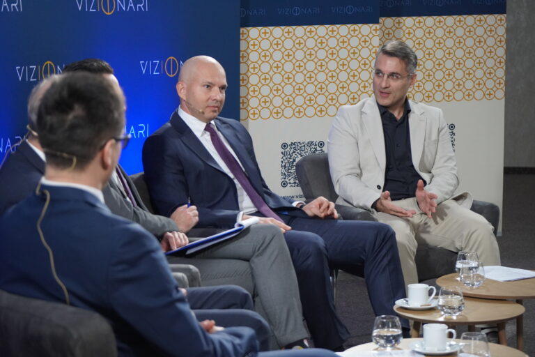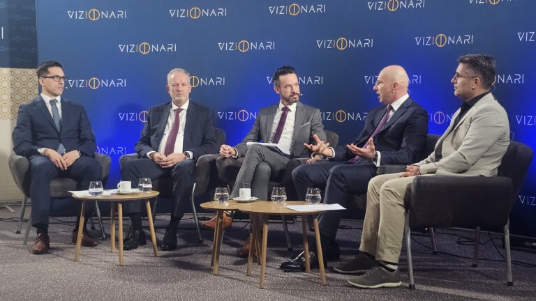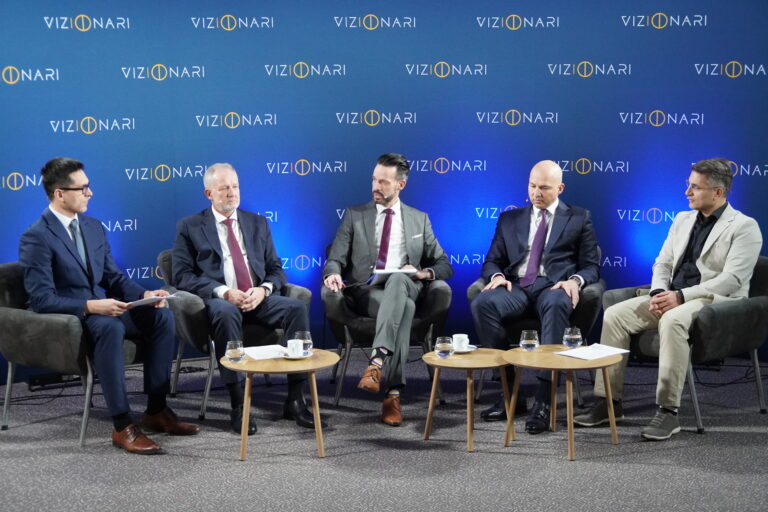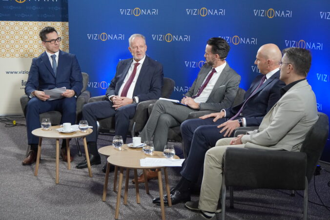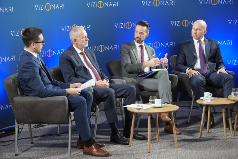 O konsolidácii a ozdravovaní verejných financií diskutovali štyria ekonomickí experti - vedúci oddelenia rozpočtových analýz a prognóz z Rady pre rozpočtovú zodpovednosť (RRZ) Pavol Majher, predseda predstavenstva a generálny riaditeľ poisťovne Kooperativa Vladimír Bakeš, CEO Partners Group Holding SK Ján Müller a finančný analytik a pedagóg Pavel Škriniar. Foto: SITA/Vizionári.