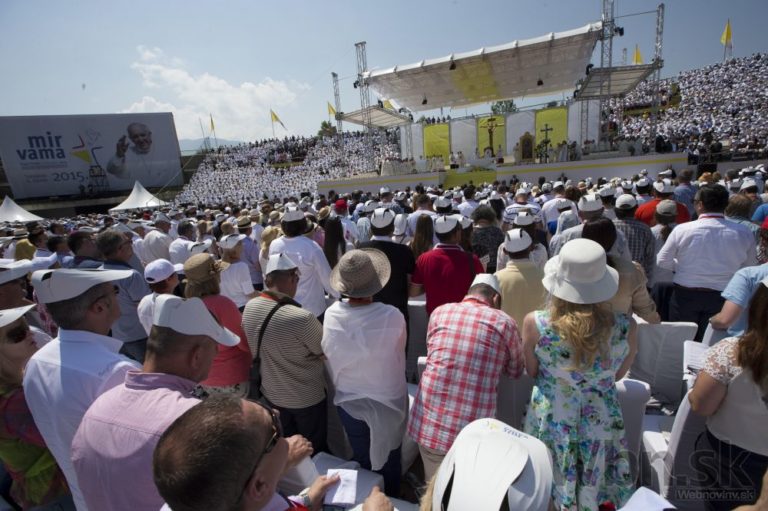 Pápeža Františka I. privítali v Sarajeve tisícky ľudí. Bosnianske národy vyzval na snahu o trvalý náboženský a etický zmier, ktorý podľa jeho slov vylieči hlboké rany pretrvávajúce v krajine aj dvadsať rokov po občianskej vojne. Foto: SITA/AP
