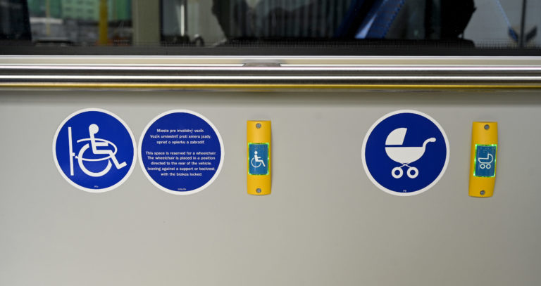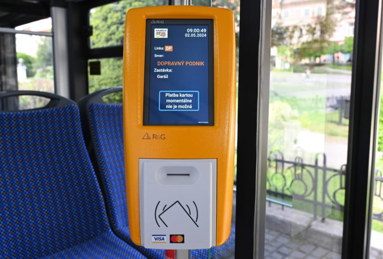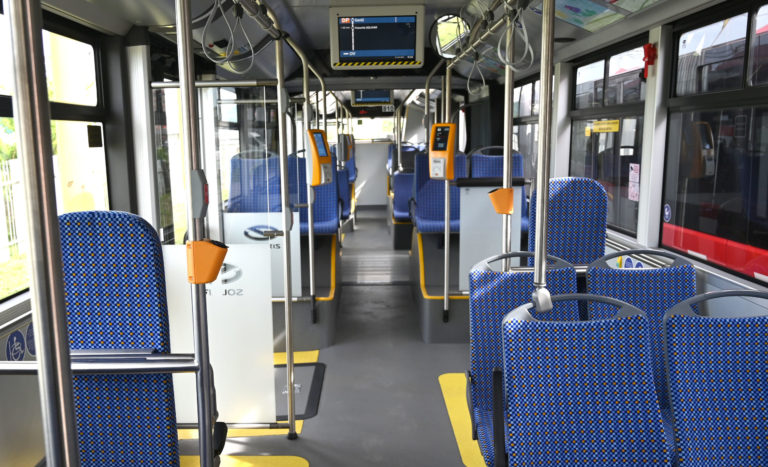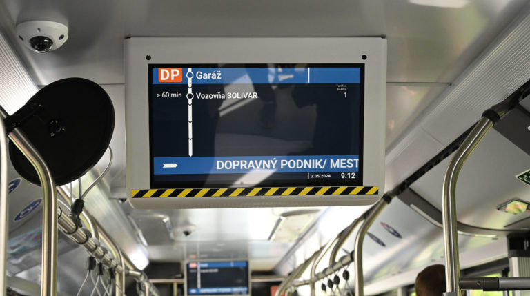 Interiér jedného zo 6-tich kĺbových parciálnych trolejbusov s dĺžkou 18 metrov a kapacitou 114 cestujúcich, ktoré sú najmodernejším prírastkom do vozového parku Dopravného podniku mesta Prešov (DPMP). Do výbavy trolejbusov patrí klimatizácia, modernejší informačný a tarifný systémom, USB nabíjačky pre dobíjanie mobilných zariadení, informačné LCD monitory a kamerový systém so záznamom v interiéri vozidla. Prešov, 2. máj 2024. Foto: SITA/Viktor Zamborský