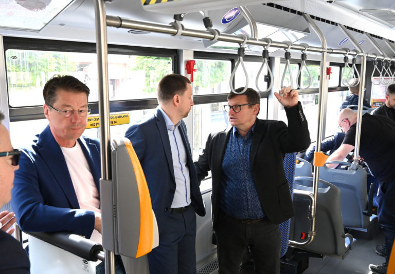 Zľava: Poslanec mestského zastupiteľstva v Prešove Ľuboš Micheľ, budúci riaditeľ DPMP Peter Dávidov a primátor Prešova František Oľha počas predstavenia 6-tich kĺbových parciálnych trolejbusov s dĺžkou 18 metrov a kapacitou 114 cestujúcich, ktoré sú najmodernejším prírastkom do vozového parku Dopravného podniku mesta Prešov (DPMP). Do výbavy trolejbusov patrí klimatizácia, modernejší informačný a tarifný systém, USB nabíjačky pre mobilné zariadenia, informačné LCD monitory a kamerový systém so záznamom v interiéri vozidla. Prešov, 2. máj 2024. Foto: SITA/Viktor Zamborský