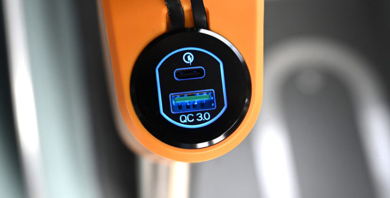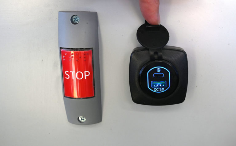 Detail USB nabíjačky v interiéri jedného zo 6-tich kĺbových parciálnych trolejbusov s dĺžkou 18 metrov a kapacitou 114 cestujúcich, ktoré sú najmodernejším prírastkom do vozového parku Dopravného podniku mesta Prešov (DPMP). Do výbavy trolejbusov patrí klimatizácia, modernejší informačný a tarifný systémom, USB nabíjačky pre dobíjanie mobilných zariadení, informačné LCD monitory a kamerový systém so záznamom v interiéri vozidla. Prešov, 2. máj 2024. Foto: SITA/Viktor Zamborský