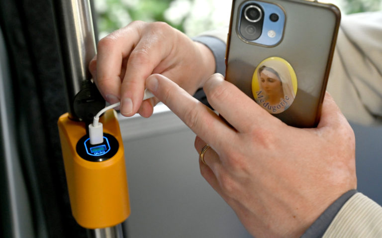 Nabíjanie mobilného zariadenia pomocou USB nabíjačky v interiéri jedného zo 6-tich kĺbových parciálnych trolejbusov s dĺžkou 18 metrov a kapacitou 114 cestujúcich, ktoré sú najmodernejším prírastkom do vozového parku Dopravného podniku mesta Prešov (DPMP). Do výbavy trolejbusov patrí klimatizácia, modernejší informačný a tarifný systémom, USB nabíjačky pre dobíjanie mobilných zariadení, informačné LCD monitory a kamerový systém so záznamom v interiéri vozidla. Prešov, 2. máj 2024. Foto: SITA/Viktor Zamborský