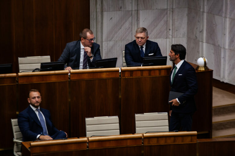 Zľava v prvom rade: Minister vnútra Matúš Šutaj Eštok, minister obrany Robert Kaliňák, zľava v druhom rade: predseda Mandátového a imunitného výboru NR SR Marián Saloň a premiér Robert Fico počas hlasovania o transakčnej dani v rámci rokovania 19. schôdze Národnej rady SR. Bratislava, 3. október 2024. Foto: SITA/Bokor Tomáš.