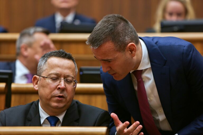 Zľava: Minister financií SR Ladislav Kamenický a minister školstva, výskumu, vývoja a mládeže Tomáš Drucker počas hlasovania o schválení zákona o štátnom rozpočte v rámci rokovania pokračujúcej 23. schôdze Národnej rady (NR) SR. Bratislava. 3. december 2024. Foto: SITA/Tomáš Susko