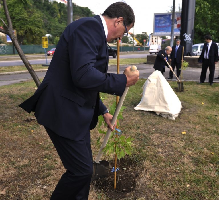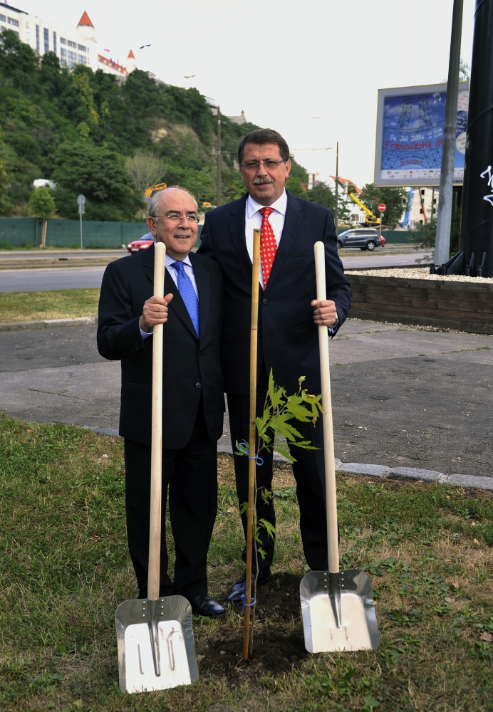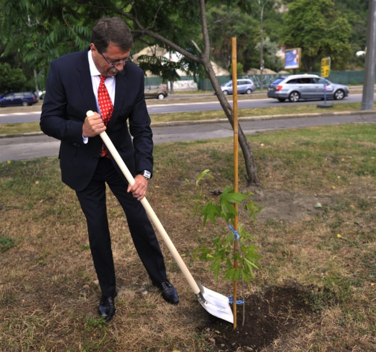 Predseda NR SR Pavol Paška (vľavo) počas výsadby cyperských platanov. Bratislava, 3. júl 2014. Foto: SITA/Ján Slovák