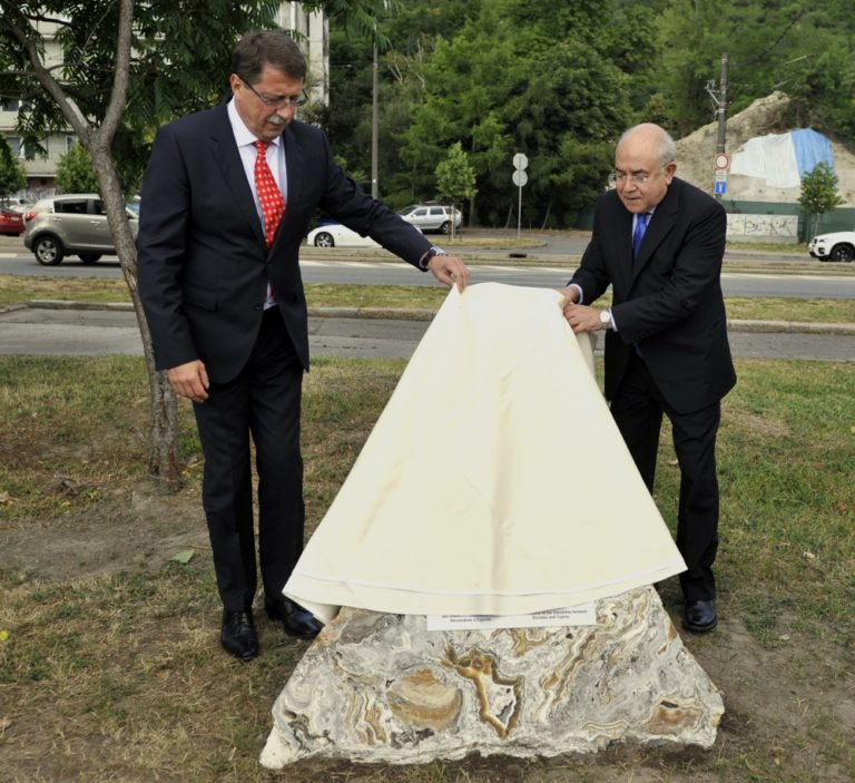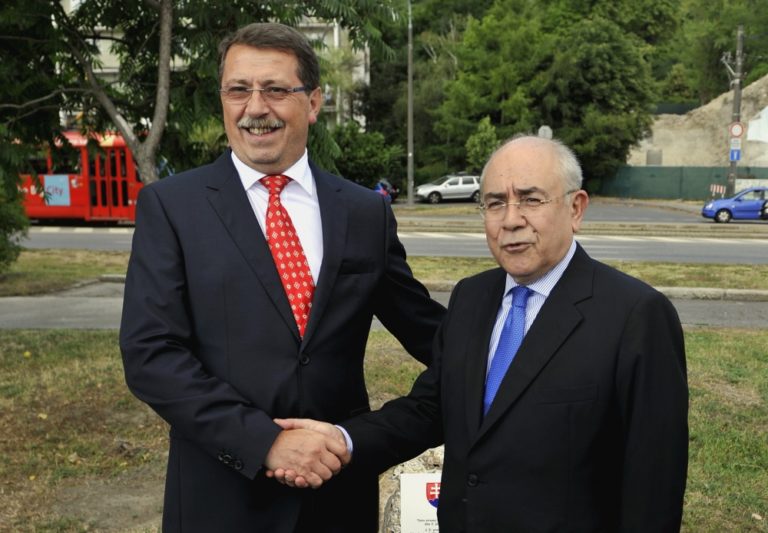 Predseda NR SR Pavol Paška (vľavo) a predseda Snemovne reprezentantov Cyperskej republiky Yiannakis L. Omirou počas výsadby cyperských platanov a odhalenia pamätnej tabule. Bratislava, 3. júl 2014. Foto: SITA/Ján Slovák